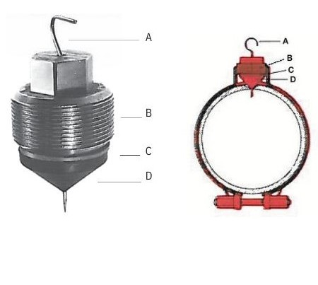 A. Pilot pin (1/16” diam. stainless steel wire). Goes down through center of force screw and cone, locates hole, guides cone point (D) to trouble spot.